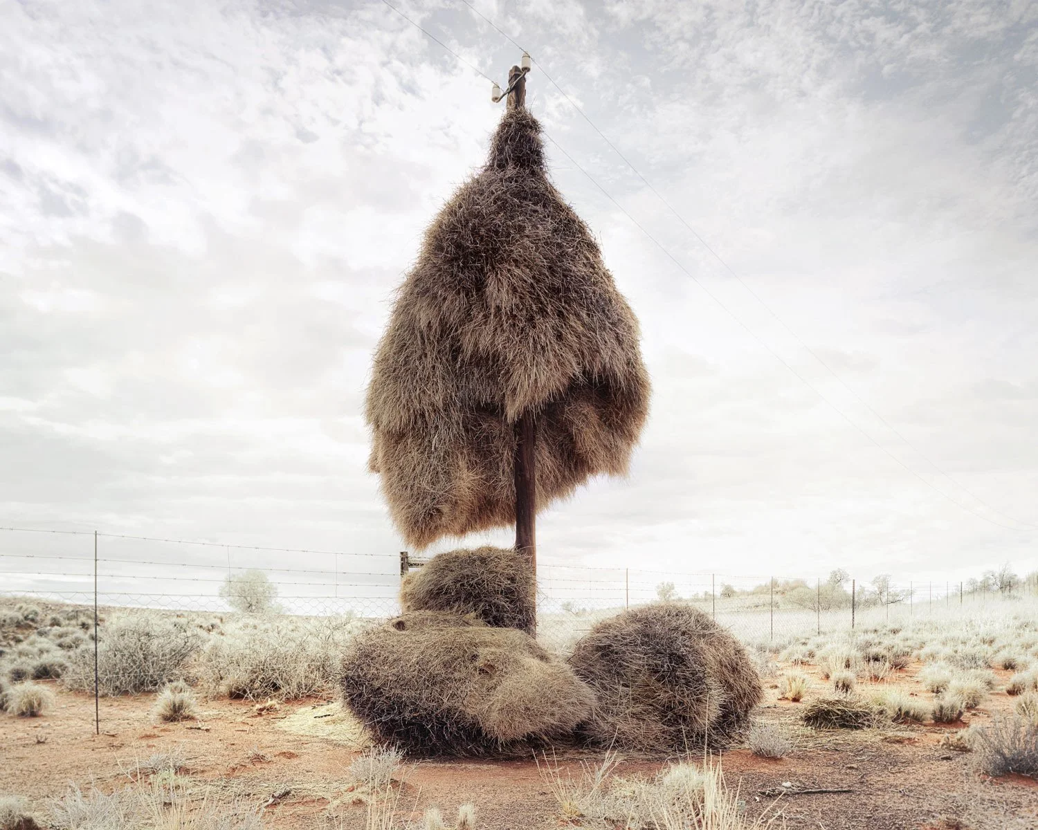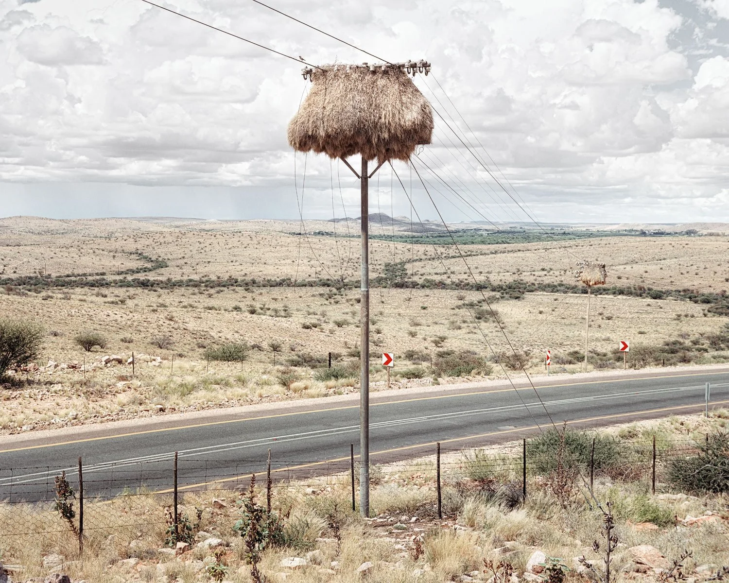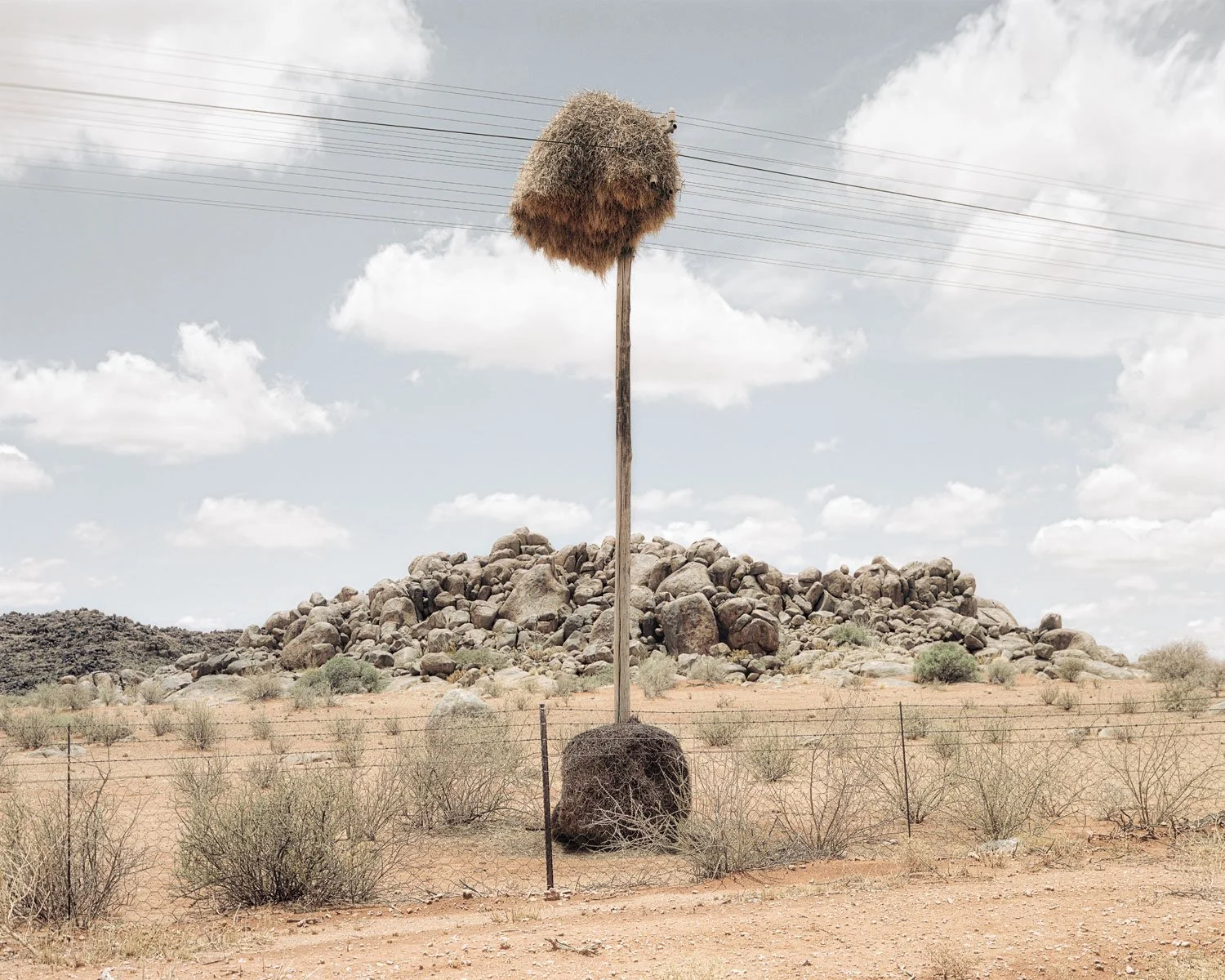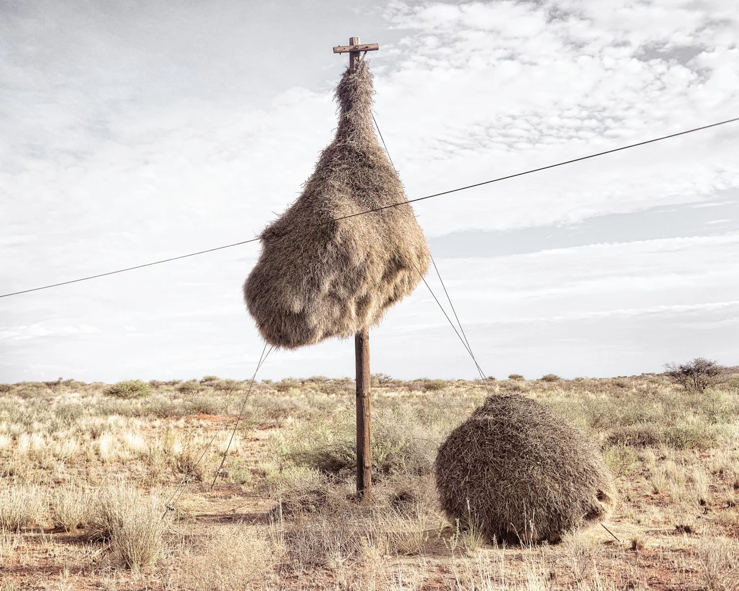 The vast barren landscapes of the southern Kalahari Desert are home to sociable weavers, small birds that create giant communal nests. They typically make their nests in trees, but those of a suitable size grow sparsely in the arid conditions. The weavers have adapted to use the next best thing; recurring telephone poles that cut across their habitat. Year after year they add to their nests, creating burgeoning structures that eventually outgrow their ability to resist gravity.
